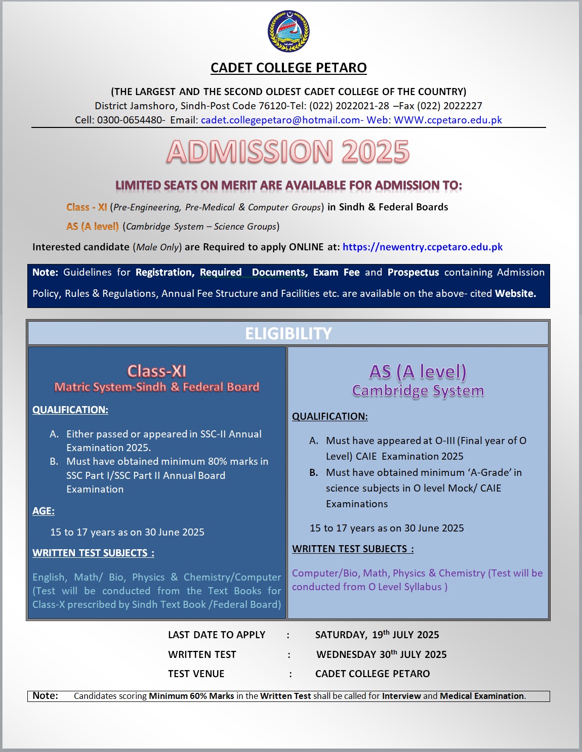 ADDRESS : New Entry Office, Cadet College Petaro, District Jamshoro, Sindh - North: 76120. |